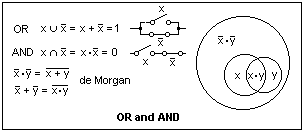 This is shown in the diagram at the left, which shows alternative ways of representing the basic operations of OR and AND, by cup and cap, by + and · or by switches in parallel and series. A Venn diagram that shows two subsets x and y illustrates what happens for different subsets. The region /x·/y is the area outside both circles x and y, that is outside x + y, while x·y is the area within both, outside /x + /y. These areas are mutually exclusive, and so are the complements of each other, which gives us de Morgan's theorems, a very important result in Boolean algebra. Note that x and y refer to the complete circles, not just to the area the letters are in. What are these areas? (x·/y and y·/x). We can split the Venn diagram into elementary areas, and combine these in various ways, which is equivalent to doing algebra with the symbols, applying the rules of Boolean algebra.