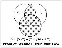 It is clear that OR and AND are associative and commutative, like ordinary addition and multiplication. However, not only is x·(y + z) = x·y + x·z as in ordinary algebra, but also x + (y·z) = (x + y)·(x + z). Indeed, x·x = x and x + x = x, so that any element is idempotent. These rules can be proved with Venn diagrams. The proof of the second distributive law is shown at the right. The dotted area can be expressed in two ways, which gives the result. It is mainly the idempotency and the second distributive law that make Boolean algebra seem strange, but it is all quite valid. Indeed, we have 1 + 1 = 0 + 1 = 1 + 0 = 1, and 0 + 0 = 0. Similarly, 1·1 = 1, 1·0 = 0·1 = 0·0 = 0. Strange but true.