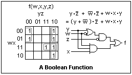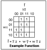 A K-map for a function of four Boolean variables is shown at the right. It is an arbitrary function, defined by putting 1's wherever a 1 ("true") output is desired. Note how the values of w, x, y and z are arranged, so that the areas on the Venn diagram that are contiguous are contiguous in the K-map. In going from one cell to a neighboring one, horizontally or vertically, the value of only one variable may change. Hence the order is 00, 01, 11, 10--not the order of increasing binary numbers. Also note that the diagram is continued from the right edge to the left, and from the bottom to the top, since the regions are contiguous.