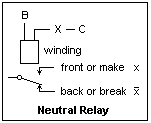 The representation of a neutral relay is shown at the right. It has a coil or winding on a magnetic core. A current through the winding produces a magnetic flux that attracts the armature holding the contact fingers, changing the connection from the back contacts to the front contacts (so named from the physical position on early relays). The contacts are returned to the unenergized position by gravity or a spring. The drawing shows the contacts as if falling by gravity, rising by attraction. All contacts associated with the same winding operate simultaneously. The control circuit is shown, from B to C through the winding, controlled by the Boolean function X that is some arrangement of switches. In this case, switches usually means other relay contacts, and only rarely an actual mechanical switch. When X = 1, then the relay picks up and x = 1, /x = 0 if the contacts are labelled as shown. The relay is an amplifying device, analogous to a vacuum tube or transistor, and can serve many of the same functions. It is, however, a strictly digital device with only two states. Its power gain can be very high, but here we are talking about control circuits, where the power is as small as possible. Relays controlling large amounts of power are called contactors.