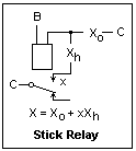 The relay analogue of the flip-flop is the stick relay, whose circuit is shown at the right. The control circuit of the relay includes a contact on the relay itself to give an alternative excitation path that can be closed when the relay operates. This hold circuit is controlled by the Boolean Function Xh. Therefore, the control circuit as a whole is characterized by the Boolean function X = Xo + xXh. An oscillator is created if /x is in the operating circuit, as in a doorbell buzzer.