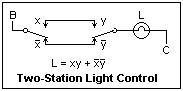 Our example for switch logic is the classic and familiar problem of the light that is to be controlled from two different locations. Either location must be able to turn the light on or off, independently of the position of the switch at the other point. The K-map for this problem is shown at the right. For either value of y, the function can be made 0 or 1 by adjusting x, and vice-versa, so the corresponding logic function will do the job.
