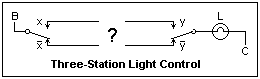 Let's now generalize the problem. Suppose you wished to control the light from a third position as well, as suggested by the diagram at the right. What can you put in place of the "?" ?. Do you need more wires? Write down the K-map for this problem the same as for the two-station case. The result will be a map with 1's and 0's in a kind of chessboard arrangment. No simplification by looping 1's can be made in such a case, but this K-map is a very characteristic one. For two variables (as above) it yields the EQV operation, or the XOR for the complement. It's useful to be able to indentify this particular K-map when it occurs.