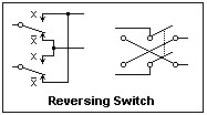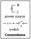 Some of the circuit diagram conventions that I shall use are shown at the right. The letters B ("Battery") and C ("Common") will be used instead of battery and ground symbols, both for conciseness and to avoid unnecessary specification of polarity. B may be positive or negative with respect to C, and this will have no effect in the unipolar circuits that I shall discuss. Curiously, railway signal engineers have assigned positive polarity to the short line in the battery symbol, instead of the currently more usual long line. A switch is labelled with a letter like "x" that represents a Boolean variable: switch open is x = 0, closed is x = 1. Instead of using the switch symbol, a break in a line representing a conductor containing the corresponding letter is used for simplicity. A capital letter, such as X, represents a complex circuit of switches. When X = 0, there is no conducting path, while X = 1 signifies a conducting path, equivalent to a closed switch. We are concerned only with connectivity, not with voltage or current levels.