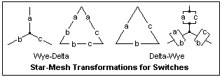 The wye-delta and delta-wye transformations (special cases of the star-mesh and mesh-star transformations) may be familiar to you from circuit theory. The equivalents for switching logic are shown at the left, and are fairly obvious to derive, remembering that two equivalent circuits must have the same truth tables. This transformation can reduce a non-series-parallel circuit to a series-parallel circuit (or vice-versa). Try it on the bridge circuit of the preceding paragraph, and reduce the result to the function X expressed there.