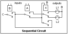 Circuits involving stick relays are sequential, since the outputs may depend on past values of the inputs in addition to the current ones. This distinction between combinational and sequential circuits is important in digital design. The reader is referred to digital design texts for matters such as state diagrams and the general procedure for sequential design, all of which applies to relay logic as well. Here, I shall discuss only a simple sequential problem, that of determining the order of operation of two relays A and B. Different outputs should result if A closes before B or B closes before A.