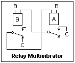 A relay multivibrator is shown at the left. Its frequency depends on the operating times of the relays. I found a frequency of 25 Hz with my relays, where I used catching diodes to eliminate sparking. The operating time of a relay may be lengthened by shading the magnetic circuit (applying a shorted conducting loop that opposes the rate of flux rise), by using a mechanical dashpot to slow the action, or even using a thermal element to delay the operation by seconds. These modifications may interfere with good contact action and cannot be used if any considerable power is controlled (unless the contact mechanism is changed to give some "snap" action).