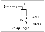 A relay can perform logic operations depending on the wiring of its control circuit and its contacts. In the figure at the left, xy in the control circuit determines the basic operation, while the output contact gives either AND or NAND. This is similar to diode logic, with the relay taking the place of the transistor as an amplifying element. It is easy to see how to realize an inverter or a buffer, both of which are often required.