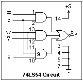 As a concrete example, consider the realization of the digital function discussed above in AND-OR form. The first step is to construct the K-map for the complementary function, which is shown in the figure at the left. The 1's are grouped into two groups of four, and one group of two, and the function written down in AND-OR form. The 74LS54 can realize this expression, as shown in the circuit below, with the pin numbers shown. Pin 8 is a no-connection. One of the three-input AND gates is a spare, and an input is tied low to remove it from the circuit. This circuit was tested for each of the 16 possible input states, and was found to realize the desired function (with a propagation delay of only 20 ns).