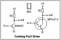 On test, my port successfully drove a 2N4401 transistor supplying about 100 mA, with a collector voltage of 0.22 V. This is well beyond the call of duty, but shows what can happen with a good port and a good transistor. More conservative is the use of a Darlington transistor, which requires very little base drive, but a base voltage above 1.5 V. The MPSA13 delivered 85 mA with a collector voltage of 0.76 V. Darlingtons will not pull lower than this, so they are not suitable for driving logic. The simple circuits for testing the port are shown at the right. The 50Ω 1/2 W resistor is two 100Ω, 1/4 W resistors in parallel. At 100 mA, they will be dissipating close to their limits, and may get warm. Both the 2N4401 and MPSA13 are based EBC, as shown looking at the flat side.