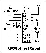 The ADC0804 is designed so that it can be used on a computer bus. This means that its digital output pins are in a high-impedance state unless the RD (read) pin is pulled low. Also, the chip is disabled unless the CS (chip select) pin is pulled low. For static tests, we simply ground both pins. If CS is low, and the chip is active, a low pulse on the WR (write) pin causes a conversion to begin. Nothing is written to the ADC; this is simply a message that a computer can use quite naturally. When the conversion is finished, a low level appears on the INTR (interrupt request) pin to signal the fact. It does not have to cause an interrupt, but can merely be sampled to find out the converter status. If we connect INTR to WR, the end of each conversion will begin a new one, and the converter will always display the latest data at its output. We will trigger conversions manually.