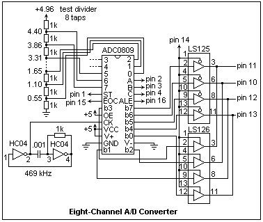 A circuit using the LS125 and LS126 buffers is shown at the right. The 28-pin ADC0809 has an analog multiplexer to choose one of eight inputs, which makes it an interesting chip for data aquisition. The circuit shows how an ADC0809 can be interfaced to the ordinary parallel port to give eight input analog channels. A serious design error in the chip was not bringing the multiplexer output and the comparator input to external pins, so that a single sample-and-hold circuit could be used. The ADC0809 requires eight separate sample-and-hold circuits, if they are necessary. The interface shown assumes the analog signals are steady, so the conversions will be accurate. Any of the inputs could be equipped with a S/H if necessary, controlled, for example, by pin 17, which is still uncommitted. In the 16-channel ADC0816, this error was corrected. Unfortunately, this comes in an even larger, 40-pin DIP. There is very little discussion of the errors in converting a dynamic or noisy signal in the National data book, though this is a very nasty problem that must be solved in any practical case. 12-bit converters give 12-bit precision, but usually not 12-bit accuracy!