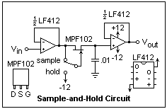 A pretty good S/H can be put together from discrete components, as shown at the right. A more practical discrete sample-and-hold circuit is given in Signal Switching. The LF412 is a dual FET-input op-amp with very small input bias currents. Bipolar op-amps are not suitable, because the input base currents are too large. The circuit is basically two unity-gain buffers, with a hold capacitor between them, and a switch to disconnect the input. The switch is made from a JFET, which does very well. To sample, the gate is connected to the drain (or the source), and to hold, the gate is connected to -V. This is not a very convenient way to control the JFET, but it works for a demonstration. One could also use a MOSFET, such as one of those in the CD4007, but I did not do it here. Control of the MOSFET would be simpler, since the gate could just be connected to +V to sample and -V to hold, because it is isolated. Apply an input voltage with a potentiometer, and watch the output voltage track it while the gate is connected to the drain. When the gate is connected to -V, the output will freeze, and you will note that it droops slowly but steadily. Measure the time required for it to fall by 1 V. I found about 5 minutes, so the droop rate is 3.3 mV/s. This corresponds to a leakage current of only 33 pA, an excellent result.