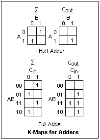The Karnaugh maps for what are known as a half adder and a full adder are shown at the right. These are just another way of expressing the truth table, but they show how the circuits can be built. A half adder needs only a 74LS86 XOR gate and a 74LS08 AND gate to produce the sum, Σ, and the carry out. The carry out goes to the next highest bit, so a definite order of bits is implied. The half adder has no carry input, which is why it is so-called. There must be another addition to include the carry input. This is a more complicated circuit, with two XOR gates to give Σ, and a pair each of AND and OR gates to create the carry out. Note that there are three inputs and two outputs to a full adder.