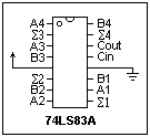 It is not necessary to make adders from discrete gates. Four cascaded full adders are in a 74LS83A adder, whose pinout is shown at the left. Note carefully the midships power connections, and that +5 is on the left. This inconvenience is relieved in the 74LS283, which is the same but with corner power pins (the pinout is different, of course). The inputs are A and B, and the outputs are Σ. There is a carry in to the least-significant bit, and a carry out from the most significant bit. It is obvious how to cascade these packages to handle any number of bits.