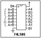 Both signed and unsigned integers can be compared to tell if one is greater than, equal to, or less than the other. This comparison is different in the two cases. For example, with signed integers, 1111 (-1) is less than 0000, while for unsigned integers, 1111 (16) is greater than 0000. The 74LS85, whose pinout is shown at the left, compares two unsigned integers. It has three pins for the input of A lt B, A=B and A gt B status (gt, lt to keep the browser happy), as decided by the lower-order nibbles, includes the comparison for the present nibble, and outputs the status of A lt B, A=B, and A gt B for use, or for feeding to the next comparator. The status inputs of the least-significant nibble are A lt B = A gt B = L (low value, or 0), and A=B = H. This is reasonable, since before any bits are considered, the two values are equal. It should be clear how the comparators are cascaded to compare numbers of any size.