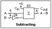 Also try a variety of subtractions, noting the result and the state of the carry out. The basic relation we are using is that x + /x = -1 (all 1's), so that /x = NOT x is the 1's complement of x. Then, x + (/x + 1) = 0 (and a carry), so that /x + 1 is the 2's complement, and represents the negative of x. This is the reason we do not have to build subtractors explicitly--adders will do the job. In fact, the 8048 microcomputer had no subtraction instruction at all, just add and complement, and the ability to control the carry flag, which was sufficient. For a long time, microprocessors had no multiply or divide instructions, since this was easy enough to do with a subroutine that involved shifting and adding (or subtracting). It is even possible to take square roots, and many other things, just with the basic adder.