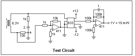A test circuit is shown at the right, which is easily assembled on a solderless breadboard. The load to which the power is to be measured is represented by the 1k resistor in series with a 2 μF capacitor (which cannot be electrolytic, of course). The voltage is applied by a transformer. Since here the voltage is applied directly to the 633, about 6.3 V rms is the maximum that is allowed. In most cases, a voltage divider would be used so that the voltage applied to the 633 is less than ±10 V. The transformer is necessary, especially if the AC supply is the mains supply, for safety as well as so node "a" on one side of the load can be assumed to be ground. The current sensing resistor is chosen as 100 Ω, and the voltage is amplified by a factor 10 by the inverting amplifier using an LF411. In general, the sensing resistor and the gain of the amplifier can be chosen as convenient in any particular case.