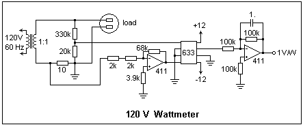 The modifications required to build a practical 120V wattmeter are shown at the left. With the 10Ω current sensing resistor, the meter reads to 10W; if a 1Ω resistor is used instead, the range is increased to 100W. It is easy to include meters reading the voltage across the load and the load current, so one can get P, V and I. 1% resistors can be used in place of the 5% resistors if a more precise calibration is necessary. The divider resistors can be 1/4W resistors. The current sensing resistor should be 5 W for currents up to 0.7A rms, or even larger if larger load currents are expected. In any case, make certain that the resistors can dissipate the required power, and peak voltages to the 633 do not exceed 10V. The circuit can be fed with a Variac to set the load voltage as desired. Of course, this wattmeter works at any voltage less than 120V with no change. Again, it should be emphasized that the isolation transformer must not be omitted.