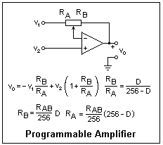 One important use of a DCP is a variable-gain op-amp circuit, as shown at the left. The inverting input is v1 and the noninverting input is v2. For this application, it would probably be better to use a DCP of greater resistance, such as the 50kΩ MCP41050 or the 100kΩ MCP41100.