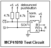 A circuit for testing the 14010 manually is shown at the right, where the potentiometer is connected as a rheostat. The pullup resistors on /CS and SI give high (1) values unless they are connected to ground. A debounced pushbutton is used as the SCK. Pressing the pushbutton should give a low to high transition, shifting in the data at SI. It is very necessary that a debounced pushbutton be used here. To program the DCP, start by grounding /CS and SI. Press the pushbutton three times to shift in 000. Now let SI go high and press the button once. Make SI = 0 again and press the pushbutton three times. Finally, let SI go high and press the button. Now shift in the data byte the same way, setting SI and then pressing the button eight times. Try, for example, the data 64 = 01000000. Finally, let /CS go high again, and the new resistance value should be read on the DMM. Repeat with data 192 = 11000000.
