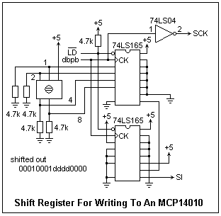 It is an interesting exercise to construct an easier way to write to the MCP14010 manually. Two 74LS165 parallel to serial shift registers can shift preset data into the DCP, using the circuit shown at the right. The data is clocked in by using a debounced pushbutton (dbpb). The command byte is hard-wired in the lower LS165, while the data byte is shown determined by the setting of a hex logic switch in the upper LS165. The clock signal used to shift the data in the shift register is inverted to serve as the SCK for the 14010. On the leading edge of a clock pulse, one bit is shifted out of the shift register and appears at SI. On the trailing edge, the bit is shifted into the DCP. To use this circuit, first the shift registers are loaded by bringing /LD momentarily low. Next, /CS on the 14010 is brought low. The debounced pushbutton is pressed 16 times, and then /CS is allowed to go high again, when the new wiper position becomes effective.