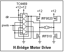 The motor power supply is shown at the right. The H bridge supplies current of either polarity. With the MOSFET's shown, it can furnish 5 A, but larger MOSFET's can be used if a higher current is necessary. The MOSFET's are driven by the very useful TC4469 from Microchip. The maximum supply voltage is 18V and the minimum is 5 V. It can supply up to 250 mA by itself, so can be used alone for small motors. The input responds to 5V CMOS logic levels, so it can be driven directly by a PIC. The direction input is simply a logic level. The feedback to the inverting inputs of the AND gate is very useful. The direction input controls which of the two upper MOSFET's is turned on, while the PWM input controls the appropriate lower MOSFET.