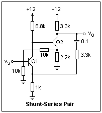 The circuit at the right has at least four feedback loops--can you identify them? Besides the two emitter resistors, there is a shunt-shunt feedback resistor whose upper end is fed by the emitter of the second transistor instead of by the collector of the same transistor. This follower supplies more current without causing a greater voltage drop in the collector resistor. There is an AC feedback loop (series-shunt) in which the 0.1μF capacitor blocks the DC bias. With this loop removed, the gain of the amplifier is about 12. The feedback factor is 1/4.3, so the loop gain is 2.8. Therefore, the gain with feedback will be about 12/3.8 = 3.16. I measured 3.11 on the circuit, at 1 kHz. This circuit is used for low-gain, wideband amplifiers, and is very stable. At high frequencies, large loop gains are dangerous. This example operates with a +12V supply, which rather restricts the "headroom" of the second transistor.