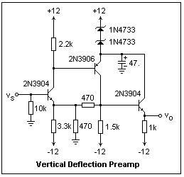 This circuit was suggested by a part of the vertical deflection preamplifier for a 100MHz scope. Quite a few resistor-capacitor combinations of a few ohms and a few picofarads have been eliminated, but the component values are the same as in the actual circuit. The eliminated components tweaked the response of the amplifier at high frequencies, otherwise having little effect. Note the two 1N4733 5.1V zener diodes to give +2V for the second two transistors. Of course, one 10V zener could be used, but this is what I had on hand. The circuit consists of a complementary pair of an npn and a pnp transistor. This use eliminates the need for coupling capacitors. The complementary pair drives an emitter follower to give a low output resistance (about 2.6Ω). There is strong series-shunt feedback between the two transistors, giving a rather small AC gain of 2.0. Note that most of the bias current of the npn transistor flows through the feedback network to ground, not through the emitter capacitor. The same thing happens in the collector of the other transistor. This is a case where the feedback network strongly loads the basic amplifier. There are many other similar circuits with more conventional feedback, if any.