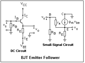 A bipolar junction transistor, a BJT, is an excellent amplifier for a follower; the circuit is shown in the figure. A bipolar power supply (this bipolar has nothing to do with the transistor's bipolar) is shown, with VCC positive, and VEE negative. There is an emitter resistor RE which sets the bias current, and provides the feedback. Since the emitter terminal will be at about -0.7V with the input grounded, it is easy to find the required value of the resistor when the desired emitter current is known. The emitter current only differs from the collector current by the small base current, which is less than 1% of the whole, so usually we neglect the difference, as it will not have any practical effect on our analysis. The base resistor RB is there only to provide a path to ground for the base current. It is actually an annoyance otherwise, lowering the input resistance. It can be as large as 1/10 of the resistance looking into the base of the transistor and have a negligible effect on the bias. An AC input can be coupled with a capacitor (not shown), and an AC output can also be taken through a capacitor, to avoid disturbing the DC bias.