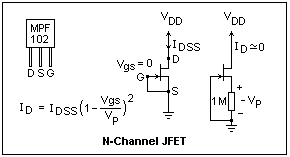 The third terminal is the gate (G), which is the control terminal. It makes a PN junction with the channel, and when it is reverse-biased (as it always must be!) the depletion layer eats into the channel and takes away the charge carriers, raising its resistance. In fact, the JFET can be used as an electrically-controlled variable resistor, but we shall not use it this way here. When the gate is sufficiently negative (in the N-channel JFET) the channel is cut off. The voltage for this is called VP, the pinchoff voltage, and is negative for an N-channel JFET. If the channel is pinched off from end to end, things are a bit boring. However, if it is pinched off only at the drain end, then it acts like a constant-current source controlled by the gate voltage. The drain current in this case more or less follows a simple quadratic law, which is shown in the figure. The two parameters are VP and IDSS, the drain current with gate and source at the same potential. The figure shows how to measure the necessary parameters with your meter. JFET's are notoriously hard to manufacture according to strict specifications, so you can save money by buying a type that is not selected to meet particular numbers. For example, the MPS102 can have IDSS anywhere from 8 to 20 mA,and VP anything less (more positive) than -8 V. Find a JFET and measure its VP and IDSS. Mine had -3.8 V and 12.2 mA, respectively. The values of VP and IDSS usually track.