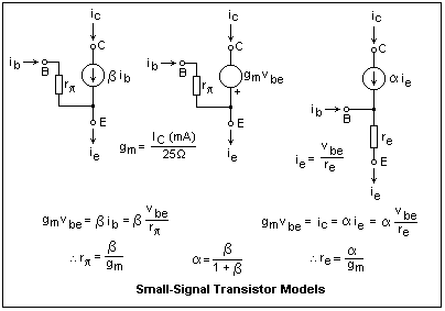 Before getting into differential amplifiers, let's review small-signal transistor models, and introduce a new one that will be of service. In the figure below, the new model is on the right, and our familiar models on the left. The resistances rπ and re both are related to how much the output current changes with respect to input voltage, and the relations of them to the general parameter, the transconductance gm, are shown. Once you know the bias collector current, you can calculate these important parameters.