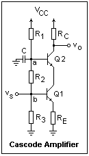 We have just seen that a differential amplifier can be considered as an emitter follower driving a common-base amplifier, the emitter follower providing the desired low output impedance. The base can also be driven in another way, by the collector of a current source with very high internal resistance, and this circuit is called the cascode, which is shown in the diagram at the left. Q1 acts as a voltage-controlled current source here. The output resistance of a transistor is 100k or greater, so it makes a good current source, even if the collector voltage is varied, that does not require a lot of supply voltage (as a large resistor would, for the same current). This current is then injected into the emitter of Q2, which simply passes it along, since alpha is practically unity. The base of Q2 is grounded for signal purposes by the capacitor C. The collector voltage of Q1 is equal to the voltage at node "a" less the base-emitter drop of Q2. This clamps the collector voltage of Q1, making it a very good current source indeed, with an output resistance of many megohms. The voltage gain of the circuit is seen to be about -RC/RE, since RE is again a feedback resistor. The only defect is the voltage divider used to get the correct bias voltages on the bases of the two transistors, which lowers the input resistance and requires a large value of C. The reactance of C at the lowest signal frequency should be lower than the resistance looking into the voltage divider at that point (with the base disconnected), so node "a" will be held near ground. The cascode is another circuit that has a wide bandwidth.