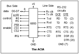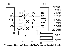 Handshaking lines are used to control when data can be sent. DTE uses a signal called RTS on pin 4, while DCE uses a signal called CTS on pin 5. One way of using these signals is to prevent the DCE from sending unless RTS, controlled by the DTE, is active (low). The DTE is prevented from sending unless CTS, controlled by the DCE, is active (low). One output and one input bit is provided on the ACIA for this purpose. The ACIA also checks another input, called CD. On DTE, this input is called DSR, and is on pin 6. On DCE, it is DTR and is on pin 20. In the diagram, this signal is held permanently at +12 V or active by a pullup resistor, so it contains no information. Indeed, it can be omitted and the CD input itself tied low. It was used in more complex links to reflect conditions on the telephone line, which are of no importance here. RTS and CTS are sufficient to provide handshaking.