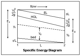 These ideas are summarized in the diagram at the right, which shows a reach between 1 and 2 in which the flow is uniform. The direction of flow is, of course, the direction in which the energy line (EL) falls. Note that the slope of the EL (s) is the same as the bed slope (s'). The average velocity V has adjusted itself to make this so, determining the depth y from the known specific energy E or discharge Q. This depth is the standard depth, and the velocity is the standard velocity, for this flow. The hydraulic grade line HGL is the water surface, which is also parallel to the EL and the bed. The critical depth yc is the lower boundary of the region for which the specific energy decreases with increasing depth (subcritical flow) and the upper boundary of the region where the specific energy increases with a decrease in depth (supercritical flow). The critical depth is the solution of the equation Q2/g = A3/b, where b is the width of the water surface. For a rectangular channel of width b, Q2/g = b2y3, or yc = [q2/g]1/3, where q is the discharge per unit width. In the diagram, y > yc, so the flow is subcritical.