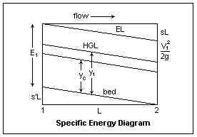 When we use specific energy, we are really using Bernoulli's principle, where the total energy H = z + E. Energy is conserved except for friction, and this causes H to decrease with distance at a rate s', so the loss of head in a distance L is hL = Hs'L. s' can be found from Manning's formula: s' = [nV/R2/3]2. For a fixed Q, the velocity V is found from the depth y by continuity, Q = VA(y). Therefore, for any depth of water we can find the frictional head loss. If the bottom of the channel varies in elevation, then E, which is the difference between H and y + z, varies accordingly.