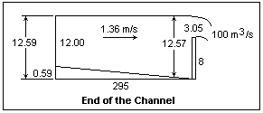 Conditions in the last reach of the channel are shown in the figure at the left. The elevation of the water surface has dropped only 2 cm in this distance, though y has decreased by 57 cm. The depth is still 12 m at the entrance of the reach, so we have about 4.5 km to go before it gets down to 3.31 m, and will thereafter be parallel to the grade line. The water surface is called a backwater curve. We have calculated only the first section, but it is clear how to proceed. We could, for example, take depths of 11.5, 11.0, 10.5, ... and get to normal depth in about 18 reaches. This is a good job for a computer, which makes calculating water profiles easy and error-free. Why not compute the next step yourself, and find out that this is really not hard at all.
