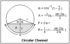 The circular channel running part-full is very commonly met with. The geometry of the channel is shown at the right. The flow occupies a segment of the circle of total angle 2α, related to the depth y as shown. There are tables of the properties of a segment, though the calculations are easy enough on a calculator. In the formulas, α is expressed in radians, but the modifications for using degrees are obvious. Unfortunately, the properties are not suitable for easy algebra, so analytic results are difficult. Solving for normal flow depth in terms of Q and S is not simple. One method would be to tabulate Q as a function of y for the given S, and then find the value of y that corresponds to the given Q. For smooth metal pipes, n = 0.011 to 0.015. For corrugated pipes, the value of n is about twice this. Galvanized corrugated pipes are often used as culverts.