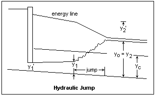 This may be illustrated by the jump shown in the figure at the left. The water comes through a gate with high velocity and a depth less than the critical depth, so the flow is rapid. The depth conjugate to y1' is y2'. Since this is greater than the normal depth on the mild slope, the jump will not occur immediately, because there is insufficient energy. The rapid flow decelerates on the mild slope, and the water depth increases, bringing down the conjugate depth. Both the energy line and the water surface are slightly concave upwards in this region, though drawn as straight. When the depth reaches y1 conjugate to the normal depth on the mild slope, the jump begins, at the first point where it is possible. It does not occur at a single section, but extends for the length of the turbulent jump (foreshortened in the diagram). It is easy to see that the momentum on the left is balanced by the pressure force on the right. The energy line falls rapidly through the region of the jump, then resumes with the mild slope, S' = S. There is also a small energy loss at the gate, from the level of the slack water upstream. There are other cases, but this is the most common one. A good place to see a jump is at the overflow spillway of a dam, with a rapid flow down the inclined face of the spillway, and a jump on the apron beyond in the tail water.