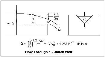 A convenient form of weir for small discharges is the 90° V-notch weir, shown at the left (the drop-down curve is exaggerated). We will assume that the velocity in the approach is negligible, so that the water level is also the energy level, and that the discharge is free, not partially or wholly submerged. We also assume that at the weir, the water depth will be the critical depth yc. We have already shown that for a triangular channel, Q = √(g/2) yc5/2. The velocity at the weir is V = Q/yc2, so the velocity head there is yc/4. Since the specific energy is equal to H (this is the usual symbol for the upstream water depth above the sill), yc = 4H/5. Expressing the discharge in terms of H, we have Q = √(g/2)(4H/5)5/2 = 1.267 H2.5 cms. Using feet instead, we have Q = 2.30 H2.5 cfs. To find Q, all we have to do is read H from the gauge at the upper end of the drop-down curve and perform a simple calculation.