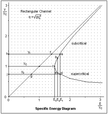 Note that the curve is plotted with respect to dimensionless variables, so the same curve can be used for any E or qm. Consider flows described by points a and c. Since they are on the same vertical line, the discharge is the same for each. The distance from the y = 0 axis to point a corresponds to the static part of E, while the distance from a to the y = E line corresponds to the kinetic energy, which sum to E. The same holds for point c, but here the static part is much smaller and the dynamic part larger. At the point of maximum discharge for this value of E, point e, the static energy is twice the dynamic energy.