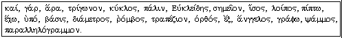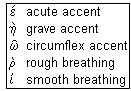 Accents are of three kinds, as shown in the Figure. The basic one is the acute accent ('), which turns into the grave accent (`) on the last syllable of a word when there is a following word. The combination of the two is the circumflex accent (^), which appears only over a long vowel in one of the last two syllables, but not before a syllble with a long vowel. The acute accent can appear over any of the final three syllables of a word if the final syllable is short, but only over one of the last two if the final syllable is long. Do not worry about these rules, just note them as you come across them. The syllable with the accent should be given a stress accent as in English, although originally the accents gave pitch information. You will find some words with two accents, and some with none, but do not worry. There are common small words, called enclitics, that have no accents of their own, since they are pronounced as parts of neighbouring words, but extra accents are added according to certain rules when there would otherwise be too many syllables in a row without an accent. Accents sometimes distinguish between words of the same spelling but different meaning, as well as give clues to grammatical form.