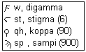 The letters of the alphabet are used to represent ordinal numbers in Greek, with α = 1, β = 2, and so on, up to θ = 9, including a strange letter for 6, the stigma, which originally represented s + t, but was dropped in the reform of the alphabet. Archaic letters retained as numbers are shown in the Figure. After 9, ι = 10, κ = 20, and so on. 34 is λδ'. Note the apostrophe to indicate that the letters represent a number. These are the numbers used to number chapters in a book, or propositions, or similar series. Large numbers were expressed in multiples of 10,000, a myriad. These numbers are unadapted to calculations, and were not used for this purpose. The Figure shows some Greek numbers, and the archaic letters that were used to express some of them.