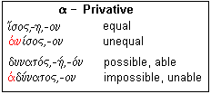The adjectives for equal, unequal and impossible are much used in Euclid. They are shown in the box on the right. A word can be negated in Greek by prefixing an α (or αν before a vowel), which is called the α-privative. When the adjectives for equal and possible are negated, note that the declension changes from three endings to two endings, and that there may be a change in accent.