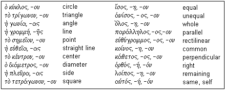 Take one noun from the first column, and an appropriate adjective from the second column, and write out the article, adjective and noun in the four cases, singular and plural. There are 10 x 10 = 100 different possibilities! Do this until you are quite familiar with the words and their endings. All the words are taken from Euclid.