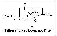 An excellent and useful example of an active filter is shown at the right, in the form of a second-order lowpass filter, a type very often required. By interchanging resistors and capacitors, it becomes a highpass filter with similar characteristics. The op-amp is used as a buffer, holding the node at the inverting input at the output voltage Vo. There is positive feedback in this circuit, but it never overcomes the negative feedback, so the circuit is stable.