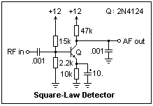 The recovery of the modulation from the AM wave is called detection. It should be clear that there is no modulation frequency in the RF wave, and no kind of filtering would produce it. Some nonlinear process is necessary to recreate the modulation frequencies. There are two general types of detectors, square-law and linear. A square-law detector has a transfer characteristic with a quadratic term: i = co + c1e + c2e2 + ..., where i might be collector current, and e base voltage. It is not necessary that only the quadratic term be present or even dominant; its presence is enough to ensure that modulation-frequency terms appear in i and can be filtered out.