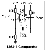 An LM311 in a comparator circuit is shown at the right, with the pin numbers for the connections. The open-collector output is at pin 7, and the ground for this transistor is at pin 1. It is shown pulled up to the logic voltage of +5 with a 1k resistor, which is typical. The output of the LM311 can sink 8 mA. A comparator's output is essentially binary, YES or NO. Pin 4 is V- and pin 8 is V+. The total supply voltage can go up to 36 V. If the comparator threshold is above ground by a volt or so, V- can simply be connected to ground, as here. The supply voltage to the LM311 does not have to be the same as the logic supply. Pins 5 and 6 should be shorted together if not used as a balance adjustment (like the nulling of an op-amp). Pin 2 is the noninverting input, while pin 3 is the inverting input. It is usual to establish the reference voltage Vr at pin 2 by a voltage divider, as shown. The reference voltage, or threshold, is about 6 V here.
