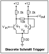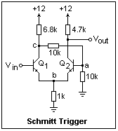 A Schmitt trigger circuit is shown at the left (it is a modification of the circuit in Jones, p. 363). Transistors Q1 and Q2 may be 2N4124's or any similar switching transistor. The input Vin should be supplied by a low-impedance variable voltage source. On testing this circuit, it will be found that the output will change from a low level of about 2.4 V to a high level of about 12 V when the input exceeds about 3 V, and will make a transition in the reverse direction when the input sinks below about 2 V. The operation of this circuit is not quite as simple as some authors seem to believe, but it can be understood by a little careful study.