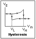 The actual voltages VHL and VLH will depend somewhat on the transistors used, but the circuit should work well, with a hysteresis of about 1.0 V. The two states are Q1 off, Q2 saturated, and Q1 saturated, Q2 off. If the input voltage is biased at, say, 2.5 V, the circuit could be in either stable state. A positive pulse of greater than 0.5 V will set the output to high, while a negative pulse of the same amount will set the output to low. The circuit is a set-reset (SR) "flip-flop" with the function depending on the polarity of the input pulse.